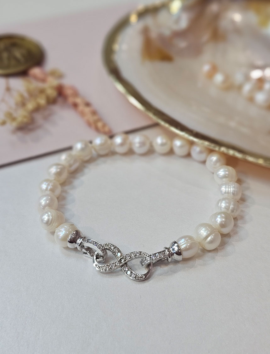Infinity narukvica spoj je prirodnih bisera i kopče inspirisane infinity simbolom, koji predstavlja beskonačnost, povezanost i trajnost. Elegantna, simbolična i idealna kao poklon za posebne trenutke.
